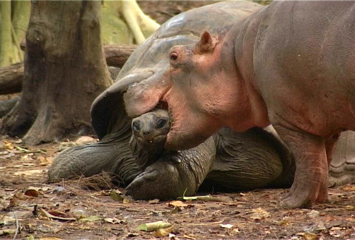 The relationship between Mzee and Owen is becoming closer. In the previous weeks, Owen has been spending a lot of time away from Mzee and in the water on his own; he also seemed to be getting friendlier with the smaller tortoise, Toto, in the boma they all share.