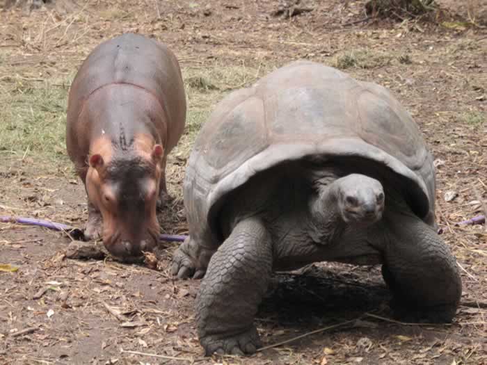 To be honest, Mzee does not appreciate his new room mate and at first hissed angrily at Owen, then lifted himself up and tried to run. Imagine a 100 year old giant tortoise trying to run! It was not hard for Owen to keep up.