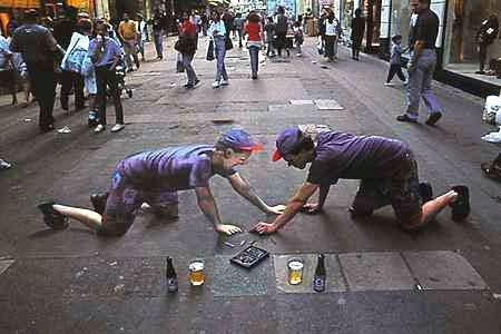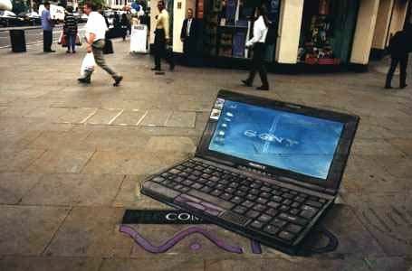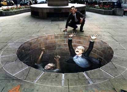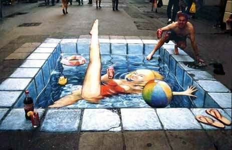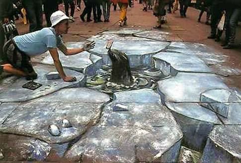 Đây là những bức vẽ trên vỉa hè . Bề mặt vỉa hè phẳng ngang, những bức vẽ trông giống như cao lên khỏi mặt đất, hoặc thụt sâu xuống.