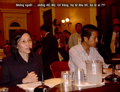 Tạ Minh Hoa [trái] và Tony Nguyễn [phải] chống đối cờ vàng trong phiên họp ở Ủy