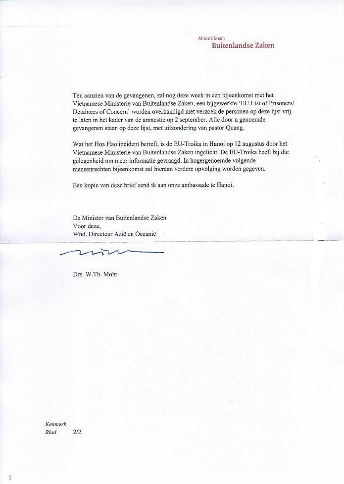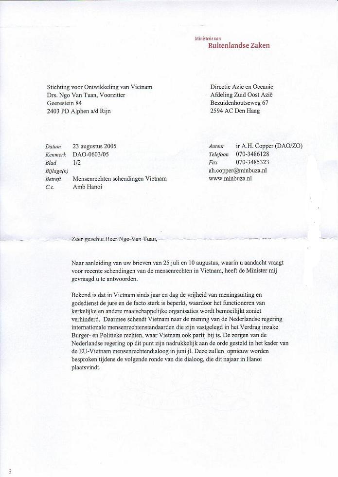 thu cua Bo Ngoai Giao Hoa Lan, de ngay 23-8-2005. Buc thu nay da