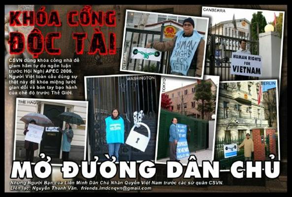 H́nh ảnh khóa cổng các toà Đại Sứ CSVN tại Washington DC (Hoa Kỳ), Ottawa (Canada), Den Haag (Ḥa Lan), Berlin (Đức), Tokyo (Nhật) và Canberra (Úc) với hàng chữ "Human Rights for Việt Nam ". Qua h́nh ảnh này, đồng bào hải ngoại bày tỏ sự ủng hộ các nhà dân chủ trong nước và nhất là phản đối việc chính quyền CSVN đă dùng các ổ khóa để khóa chặt nhà của BS Phạm Hồng Sơn và LS Lê thị Công Nhân trong thời gian diễn ra hội nghị APEC vừa qua để ngăn cản mọi tiếp xúc với chính giới cũng như báo chí quốc tế với những chiến sĩ dân chủ ḥa b́nh tại Việt Nam.