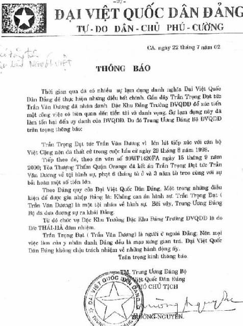 Ngày 20 tháng 07 năm 2002, ĐVQDĐ ra một Thông Báo đăng trên báo Người Việt các báoHoa Kỳ nhằm thông báo trước công luận ông Trần Trọng Đạt, tức Trần Văn Dương, đă bị khai trừ khỏi Đại Việt Quốc Dân Đảng.