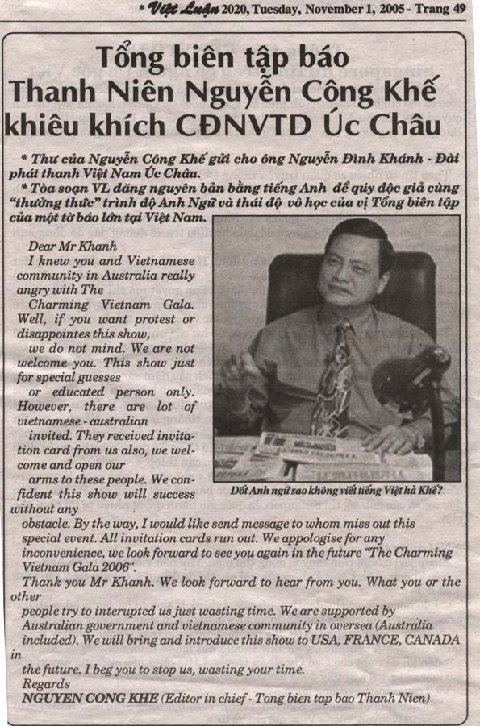 tŕnh “Duyên Dáng Việt Nam” Kính thưa quư thính giả, Tối Thứ Hai 31/10/2005, Việt Cộng đă làm một cuộc “tổng công kích” vào cộng đồng người Việt tỵ nạn Cộng sản tại Úc. Hai chiếc máy bay chỡ khoảng 450 trự, trong số đó phân nửa là đám văn công, tới Úc để tổ chức một chương tŕnh văn nghệ mừng 60 năm đảng Cộng sản Việt gian phá hoại nước Việt Nam. Chương tŕnh được chúng đặt cho cái tên rất mỹ miều “Duyên Dáng Việt Nam” mà tờ nhật báo địa phương là The Canberra Times ngày 1/11/2005 đă viết một bài dưới tựa đề rất khôi hài là “Những Người Biểu T́nh Đă Không Thấy Cái Duyên Dáng Ǵ Trong Cuộc Xuất Hiện Của Các Nghệ Sĩ Việt Nam”. Ngay ở đầu bài, báo The Canberra Times viết “Những khán giả đến nhà hát Canberra coi chương tŕnh ‘Duyên Dáng Việt Nam’ hồi đêm thứ Hai đă được dàn chào bởi một cuộc biểu t́nh lớn chưa từng có trong nhiều năm qua”. Ở phần kết luận, báo The Canberra Times trích lời của người Việt tỵ nạn Cộng sản đi biểu t́nh, họ viết “Những người biểu t́nh nói rằng bọn lănh đạo đă trở thành giai cấp tư bản và trong khi chúng đốt tiền mang 16 siêu người mẫu sang Úc để ḷe thiên hạ trong hai sưu tập áo dài, th́ có ít nhất 16,000 cô gái Việt Nam bị bán làm nô lệ t́nh dục”. Cái gọi là “Duyên Dáng Việt Nam” được đảng và nhà cầm quyền Cộng sản Việt gian giao cho tờ báo nô Thanh Niên tổ chức tại Úc, đă bắt đầu bằng một lá thơ khiêu khích của tên Nguyễn Công Khê (Tổng biên tập báo Thanh Niên) gởi cho ông Nguyễn Đ́nh Khánh là Giám đốc đài VNRA 100.9 FM ở Úc. Khê viết bằng Anh văn, một thứ Anh văn bất chấp văn phạm, chấm phết tuỳ hỉ, chúng tôi cố gắng dịch cho suông lại như sau : “Ông Khanh thân mến, tôi biết ông và cộng đồng người Việt ở Úc rất giận dữ với chương tŕnh “Duyên Dáng Việt Nam”. Tốt, nếu ông muốn biểu t́nh hay thất vọng về chương tŕnh này, chúng tôi không chấp nhất. Chúng tôi không mời ông. Chương tŕnh này mời khách đặc biệt và những người có học mà thôi. Dù sao đi nữa th́ cũng đă có nhiều người Úc và người Việt được mời rồi. Họ đă nhận được thiệp mời và chúng tôi hoan nghênh cũng như mở ṿng tay đối với họ. Chúng tôi tin chắc chương tŕnh sẽ thành công mà không có chướng ngại vật nào cả. Sẳn đây tôi muốn nhắn những người muốn tham dự là thiệp mời đă hết sạch, chúng tôi xin lỗi về sự bất tiện ấy, xin hẹn vào chương tŕnh “Duyên Dáng Việt Nam” năm 2006. Cám ơn ông Khanh. Chúng tôi chờ đợi để được nghe từ ông. Ông và những người muốn ngăn chận chương tŕnh này chỉ tổ tốn th́ giờ mà thôi. Chúng tôi được yễm trợ bởi chính phủ Úc và cộng đồng người Việt hải ngoại, kể cả cộng đồng ở Úc. Chúng tôi sẽ mang và giới thiệu chương tŕnh này sang Mỹ, Pháp, Gia Nă Đại trong tương lai. Tôi thách ông ngăn chận chúng tôi đấy, chỉ tổ mất th́ giờ. Kư tên : Nguyễn Công Khê, Tổng biên tập báo Thanh Niên” Tên báo nô Nguyễn Công Khê đă vỡ mặt ra. Hôm nay đọc tờ Thanh Niên phát hành trong nước, mới thấy bộ mặt bỉ ổi của những tên cầm viết như Nguyễn Công Khê, cam phận làm chó gặm xương sủa càn. Tờ Thanh Niên không dám viết ǵ về đoàn biểu t́nh mà báo The Canberra Times diễn tả là “một cuộc biểu t́nh lớn chưa từng có trong nhiều năm qua”. V́ khách đến toàn nhận thiệp mời, nên chẳng có khách mua vé vào xem, bọn báo nô đă đành lựa một góc có người tụ vào ngồi nhiều, chụp một tấm h́nh đăng lên tờ Thanh Niên để khoe mẻ, những h́nh c̣n lại chụp đám văn nô đang đùa giởn với nhau, hay chụp h́nh lưu niệm với vài đứa con nít 5 – 7 tuổi. Để trả lời cho câu nói của tên báo nô Nguyễn Công Khê “Chúng tôi được yễm trợ bởi chính phủ Úc và cộng đồng người Việt hải ngoại, kể cả cộng đồng ở Úc” th́ ngoài đoàn biểu t́nh của người Việt tỵ nạn Cộng sản, c̣n có Dân biểu Chris Bowen đă trả lời cho bọn Việt Cộng bằng một diễn văn trước Hạ Viện Úc, nặng cỡ một nắm đấm vào mặt Bắc bộ phủ và chương tŕnh gọi là “Duyên Dáng Việt Nam” của chúng. Ông Dân biểu Chris Bowen nói về thành tích tham nhũng và không minh bạch của bọn Cộng sản Việt gian, là 1 trong 4 quốc gia Á Châu bị Tổ Chức Minh Bạch Quốc Tế chấm điểm hạng bét. Tổ Chức Phóng Viên Không Biên Giới th́ xếp nước Việt Nam Cộng Sản đứng thứ 161 trên 167 quốc gia về vấn đề tự do ngôn luận. C̣n nói về nhân quyền th́ thôi ... khỏi nói! Vậy mà muối mặt đi tổ chức “Duyên Dáng Việt Nam” để ăn mừng cái ǵ đây? Ông Dân biểu Chris Bowen nói với các đồng viện “Điều quan trọng quư vị cần hiểu là rất nhiều người Việt ở Úc Châu cảm nhận là chẳng có điều ǵ để mừng cả”. Ông kết thúc bài diễn văn bằng câu “Từ Hạ viện Quốc hội Úc châu, tôi xin gởi đến những người biểu t́nh lời ủng hộ và tiếp tục đấu tranh v́ dân chủ cho Vi