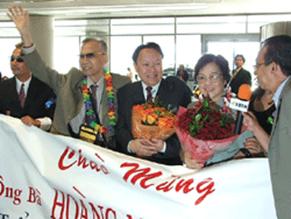 Tội phạm phản tỉnh Hoàng Minh Chính [đưa tay chào] được Bác sĩ Nguyễn Xuân Ngải [bên cạnh, ở giữa] đón tiếp tại phi trường San Francisco lúc 5:25 giờ chiều ngày Thứ Ba 30-8-2005.