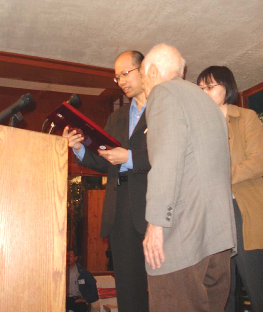 GS Nguyễn khắc Kham trao bằng tưởng lục cho ktg Trung Dung, một biểu tượng trao ngọn đuốc trí tuệ cho giới trẻ. Chị Trung Dung đứng bên cạnh
