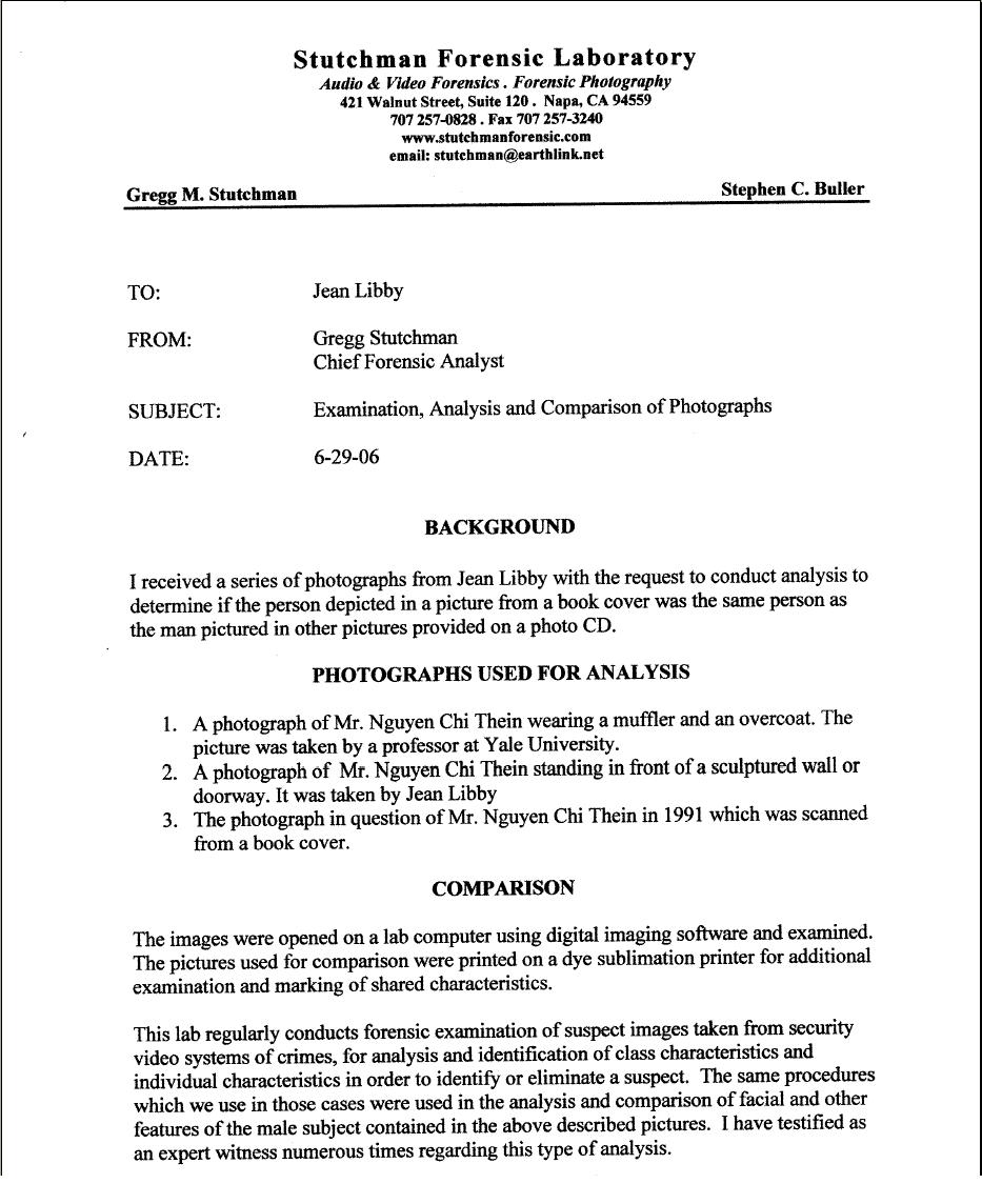 Đây là một đoạn trích trong bản báo cáo ngày 29 tháng Sáu năm 2006 của Stutchman Laboratory: "Những bức hình đã được máy điện toán của phòng thí nghiệm dùng software về hình ảnh mở ra để quan sát ... Phòng thí nghiệm này thường xuyên giảo nghiệm những bức hình chụp từ những máy quay phim video dùng để bảo vệ những hiện trường xảy ra những tội phạm, cốt để phân tích và nhận diện những đặc tính cá nhân để có thể xác nhận hoặc loại trừ một nghi can. Dùng cùng một phương pháp như vậy mà chúng tôi đã làm trong các trường hợp kể trên, chúng tôi dùng để phân tích và so sánh gương mặt và những đường nét khác của người đàn ông trong những tấm hình nói trên ... Người đàn ông trong bức hình bìa sách [Hoa Địa Ngục ấn bản 1996] đã có 8 đặc điểm nét mặt và tai giống y như người đàn ông trong hai tấm hình #1 va` #2. Dụa trên sự quan sát của tôi, sau khi so sánh và phân tích, tôi cho rằng người đàn ông trong 3 bức hình kể trên cùng là một người". Ký tên: Gregg Stutchman, Trưởng nhóm Giảo Nghiệm